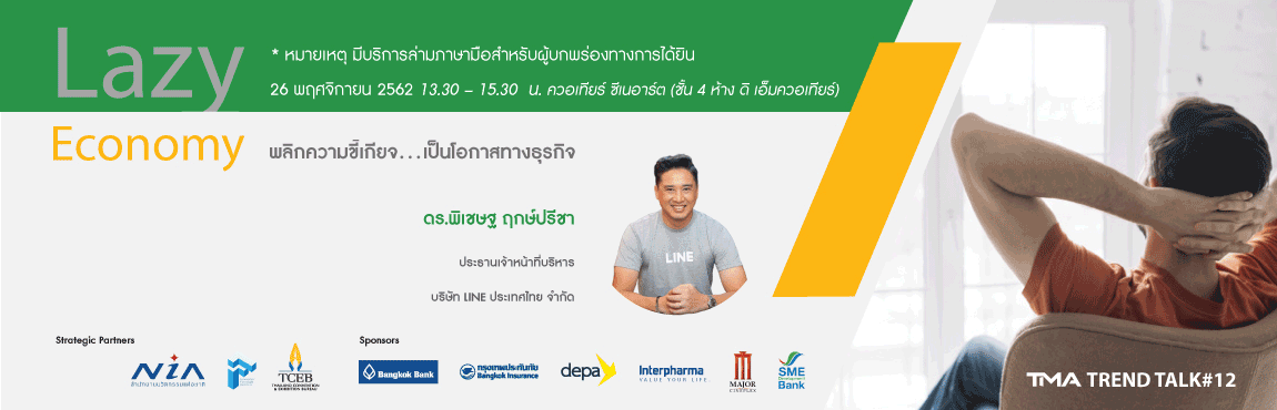 71 TMA Trend Talk #12 หัวข้อ Lazy Economy: “พลิกความขี้เกียจ…เป็นโอกาสทางธุรกิจ” - SMS Register 1 ควอเทียร์ ซีเนอาร์ต (ห้าง ดิ เอ็มควอเทียร ชั้น 4) BTS สถานีพร้อมพงษ์ 26 พฤศจิกายน 2562 เวลา: 13.30-15.30 น.