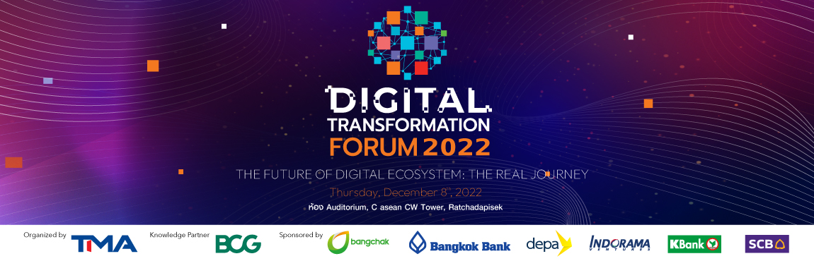 131 Digital Transformation Forum 2022 : The Future of Digitial Ecosystem SMS Register 1 Auditorium, C Asean, CW Tower Ratchadapisek วันพฤหัสบดีที่ 8 ธันวาคม 2565 เวลา 08.30 - 17.00 น.